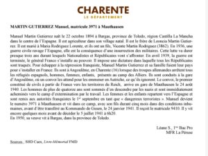 Manuel Martín Gutiérrez nació el 22 de octubre de 1894 en Bargas, provincia de Toledo, región de Castilla La Mancha en el centro de España. Es agricultor en su pueblo natal. Es hermano de Leoncia Martín Gutiérrez. Está casado con María Rodríguez Lorente, y tienen un hijo, Vicente Martín Rodríguez (3862). En 1936, una guerra civil asoló España, consecuencia de una insurrección militar. Esta lucha duró casi tres años, durante los cuales se enfrentaron nacionalistas y republicanos. En abril de 1939, terminada la guerra, el general Franco llegó al poder. Impuso una dictadura en la que todos los republicanos fueron perseguidos. Para escapar de la represión franquista, Manuel Martín Gutiérrez y su familia huyeron de su país para establecerse en Francia. Estaban en Angulema, en Charente (16) cuando las tropas alemanas arrestaron a todos los refugiados españoles, hombres, mujeres y niños, presentes en el campo de Alliers. Fueron llevados a la estación de tren de Angulema, donde los esperaba un convoy para llevarlos a Austria, que no conocían. El convoy, el primero formado por civiles de Francia a los territorios del Reich, llegó a la estación de Mauthausen el 24 de agosto de 1940. Los nazis ordenaron a los hombres mayores de catorce años que salieran y fueron llevados inmediatamente al campo de exterminio a través del trabajo. Las mujeres y los niños partieron hacia España y fueron entregados a las autoridades franquistas el 1 de septiembre como «terroristas peligrosos». Manuel se convirtió en el número 3971 en Mauthausen y vivió en este campo, con su hijo durante cinco meses en condiciones inhumanas, antes de ser trasladado al Gusen Kommando el 24 de enero de 1941. Recibió el número 9410. Vivió allí unos meses más antes de morir el 5 de julio de 1941 a las 6:20 a.m. En 1950, su viuda vivía en Bargas, en la provincia de Toledo.